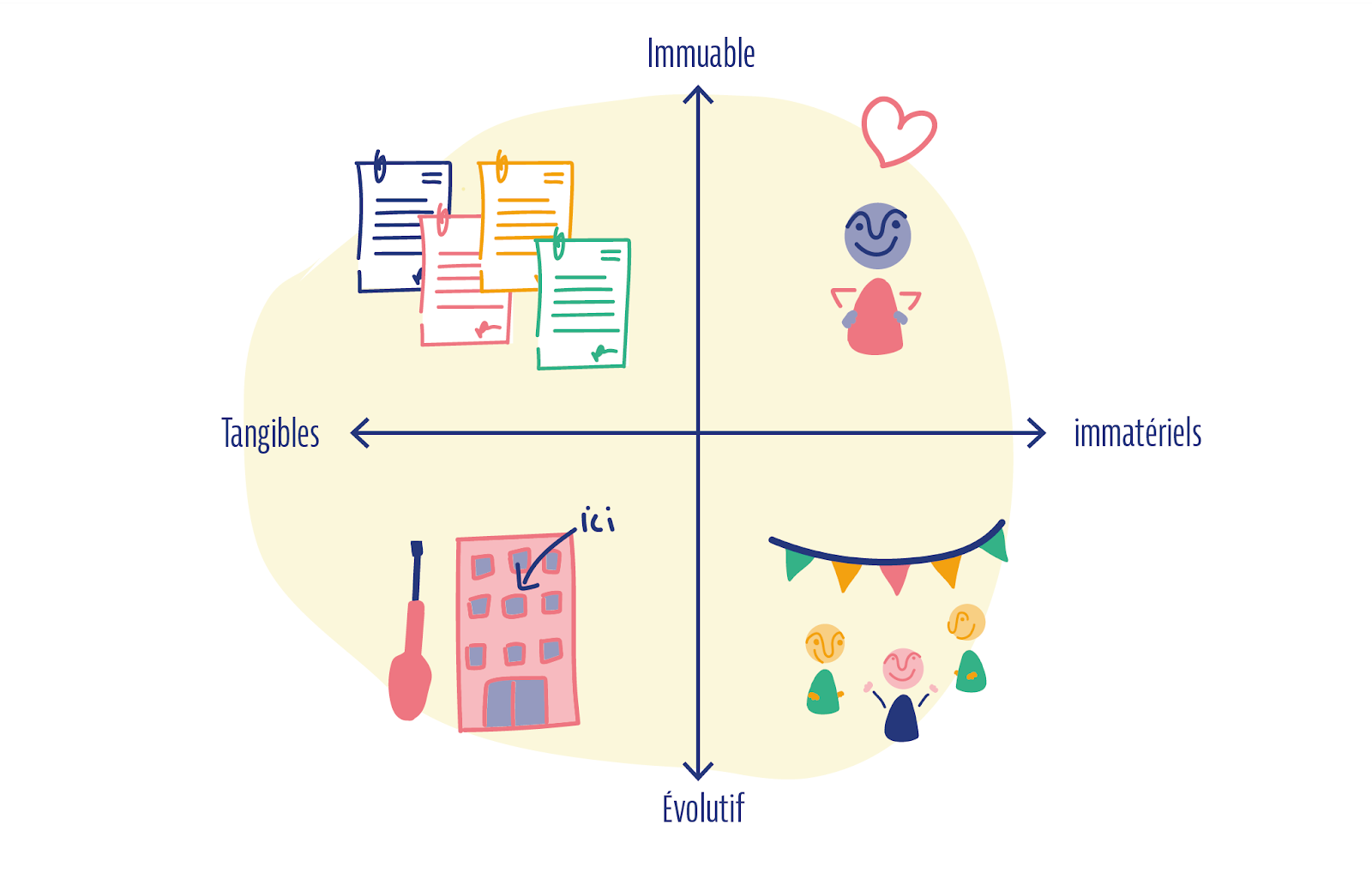 - Immatériels : Des communs qui sont la source principale de l’engagement et du sentiment d’appartenance des personnes faisant partie de la communauté. Ils ne sont mesurables que par des moyens intermédiaires (une photo pour un évènement, une affiche pour les valeurs…)
