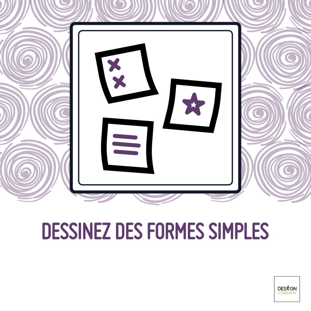 Parmi les dessins que vous pouvez réalisez, il n’y a pas que les pictogrammes. Vous pouvez représenter des cadres, des conteneurs, des flèches, des traits et autres et éléments décoratifs. Ces formes simples qui vont vous aider à structurer le texte et les pictogrammes. Essentiels dans une mise en page, elles organisent le contenu et créent du dynamisme. Elles peuvent servir de séparateur (ex : un trait), de conteneurs pour faire ressortir des éléments (ex : cadre, bulle…) ou de connecteurs pour créer du lien entre plusieurs parties (ex : flèche). En complément vous pouvez ajouter des éléments décoratifs pour agrémenter votre visuel, tel que des motifs, des lignes, des points..