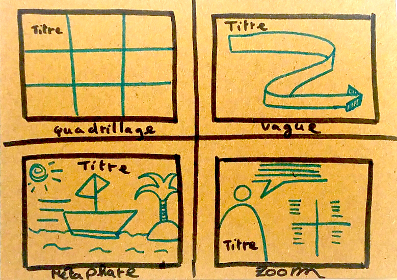 Vous pouvez être très fort en dessin, mais ne pas savoir structurer un support de facilitation graphique. L’objectif est de permettre que l’information soit comprise. Comme nous l’avons vu précédemment, commencé par le titre est un élément-clé, car sa position induit une structuration de la page.