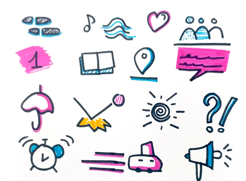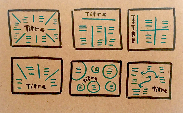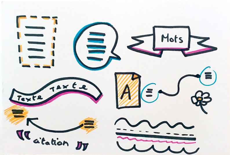 On préconise de placer le texte avant d’esquisser les pictogrammes pour faciliter la prise de notes et ne pas oublier l’essentiel. C’est aussi un bon moyen de bien répartir son contenu et de dessiner les pictogrammes de façon homogène en prenant du recul.