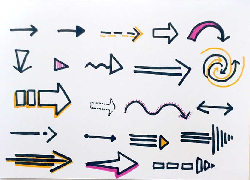 Pensez également à décliner vos dessins ! Avec un même dessin de base vous pouvez aisément en obtenir plusieurs en changeant quelques détails, par exemple la flèche peut être pleine ou vide, avec des traits pleins ou en pointillés …