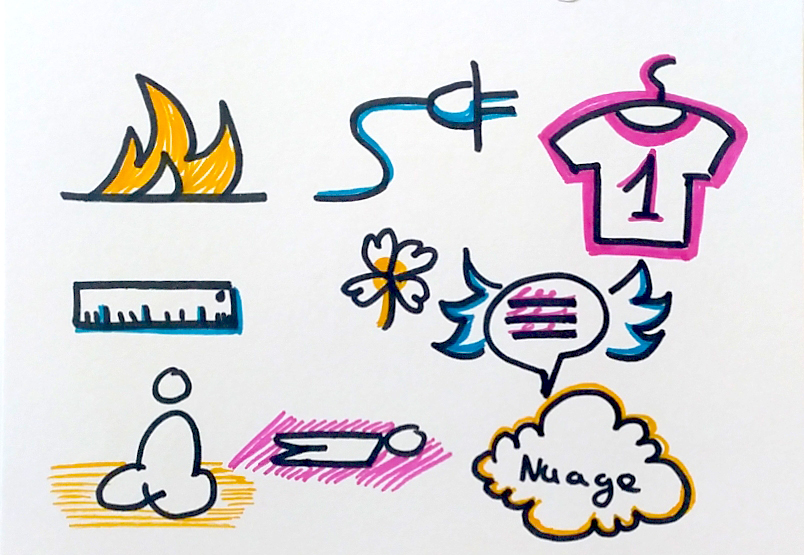 Comment je fais si je veux représenter des sujets abstraits ? Effectivement, dans le domaine du design et de l’innovation sociale, il n’est pas toujours aisé d’utiliser des formes simples pour représenter les choses. La tasse à café peut convenir pour illustrer la convivialité, mais pas l’innovation. Dans un premier temps, je vous invite à imaginer l’image qui vous vient en tête spontanément lorsque vous pensez à un terme abstrait. Par exemple, pour l’innovation je pense à une ampoule, à une étoile ou à une fusée. Parfait ! vous, n’avez plus qu’à vous entraîner à les dessiner. Pour aller plus loin, vous pouvez consulter l’article sur les 5 conseils pour les débutants en facilitation graphique.