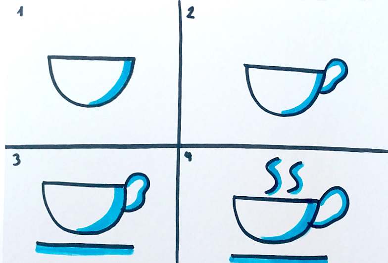 Si vous voulez dessiner, vous devez décomposer les formes. Par exemple, pour dessiner la tasse il vous faut esquisser une demi-sphère, la fermer avec un trait droit et ajouter une courbe sur le côté pour l’anse. Puis, vous ajoutez un trait droit en dessus pour la coupelle. Ensuite, vous finissez le tout en ajoutant des S au-dessus pour représenter la fumée.