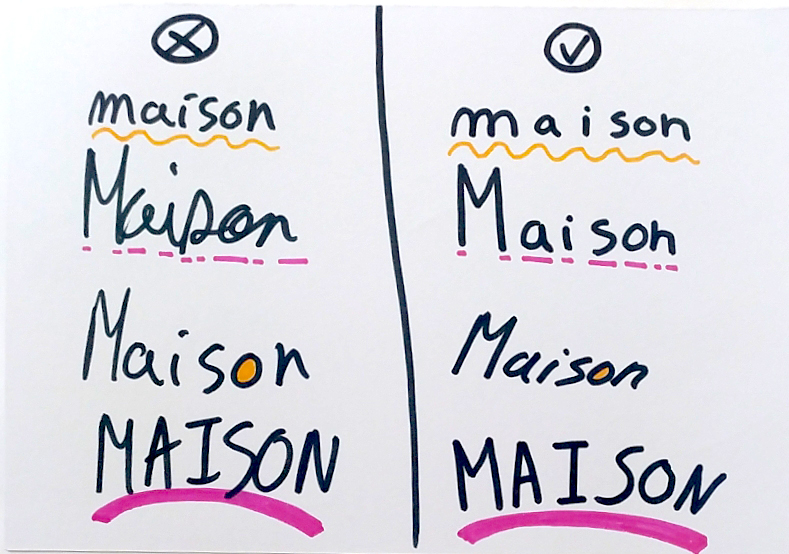 Comme vous voyez, il suffit de peu pour que l’écriture devienne moins propre. Ne vous inquiétez pas, il est toujours possible de rattraper les choses, par exemple en ajoutant une ombre ou en retravaillant le texte pour rendre ses contours plus droits. Pour vous entraîner n’hésitez pas à faire des cahiers de calligraphie, tout comme le cahier de pictogrammes, cela vous aidera à varier vos écritures et à être à l’aise pour les dessiner spontanément.