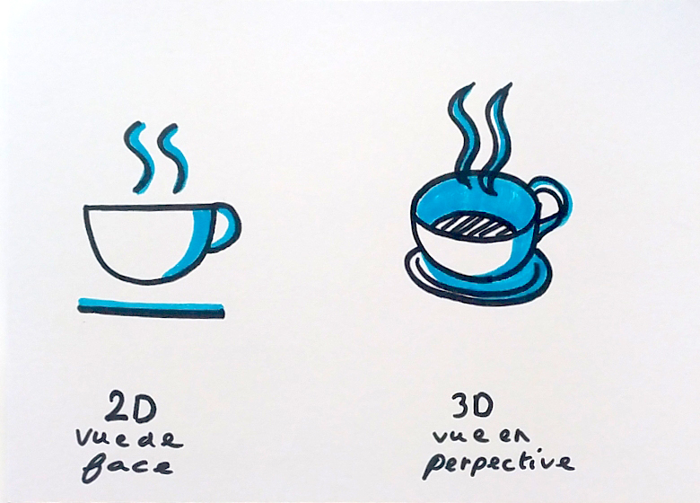 Lorsque j’ai débuté dans la facilitation graphique, une chose que j’ai bien comprise c’est qu’il faut aller à l’essentiel. Vous n’avez pas besoin de dessiner les formes en 3D : oubliez les perspectives ! Cela vous prendra trop de temps et n’apportera pas plus d’informations à votre dessin. Il est donc préférable de dessiner en 2D, c’est-à-dire comme si vous regardiez un objet de face. Prenons, l’exemple de la tasse. Il est plus évident de dessiner la version 2D de face que celle en 3D en volume. Ces conseils s’appliquent à la facilitation numérique ou sur papier.