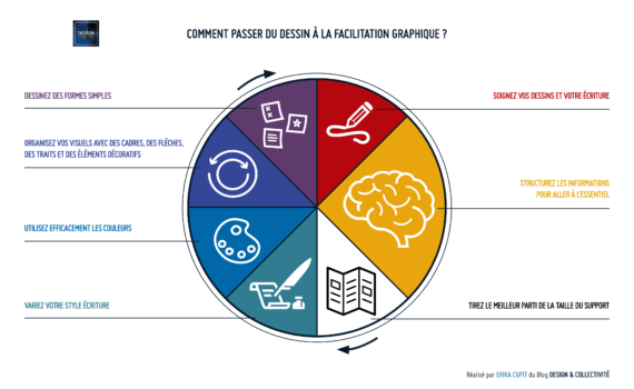 Lorsqu'on entend parler de facilitation graphique, de communication visuelle, de sketchnote ou de scribing, nous pensons qu'il faut avoir des prédispositions pour le dessin. Au contraire, la facilitation graphique ne nécessite pas de savoir bien dessiner, mais surtout de savoir utiliser des formes simples pour représenter ses réflexions ou celles des autres. Paradoxalement, savoir très bien dessiner peut être un frein, car il ne s'agit pas de créer un chef-d'œuvre, mais d'aller vite et d'utiliser des pictogrammes, des typographies et les couleurs. Il s'agit donc plus d'un exercice de composition graphique que de dessin. Vous devez agencer ses éléments de façon harmonieuse dans votre page et non réaliser une illustration digne d’un musée. Nous allons donc voir ensemble dans cet article les différentes étapes qui vous permettent de dessiner pour faire de la facilitation graphique. Ainsi, vous pouvez utiliser la facilitation par le dessin au quotidien dans votre pratique professionnelle.