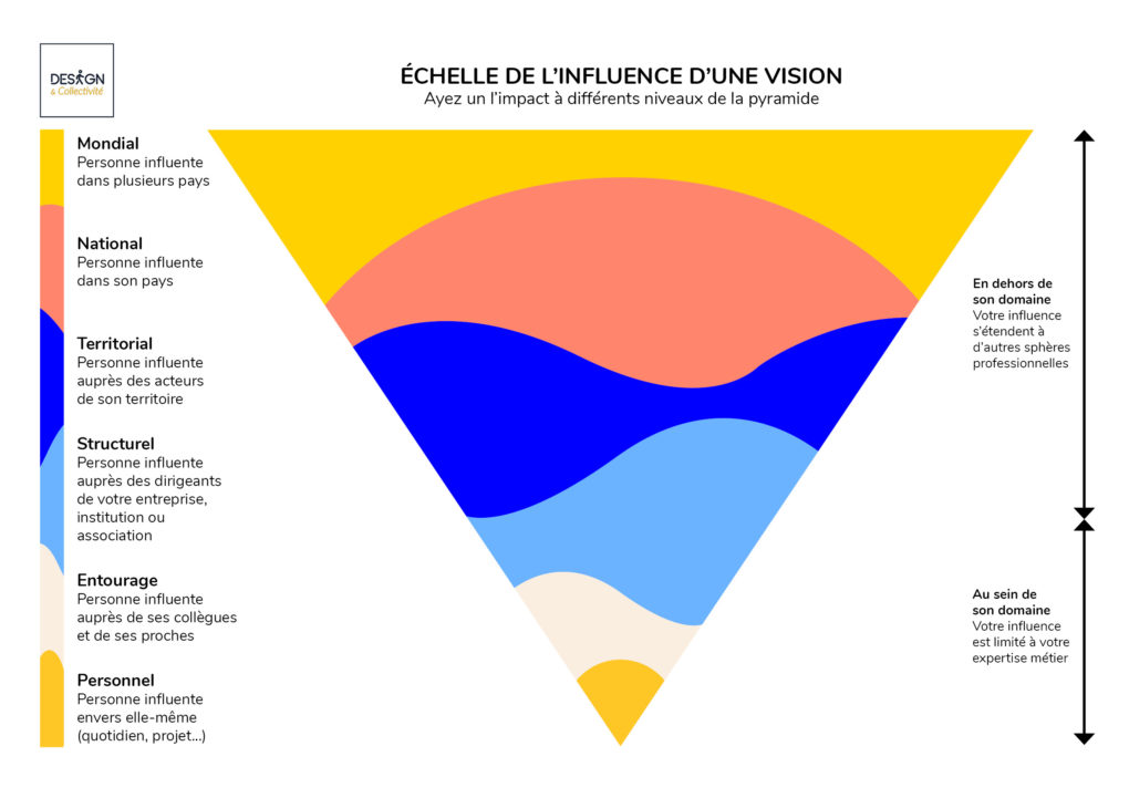 Voici également une pyramide de l’influence du vision selon différentes échelles d’intervention. On pourrait aussi faire un parallèle entre cette échelle et votre impact. Où vous situez-vous ? Vers où voulez-vous allez ?: