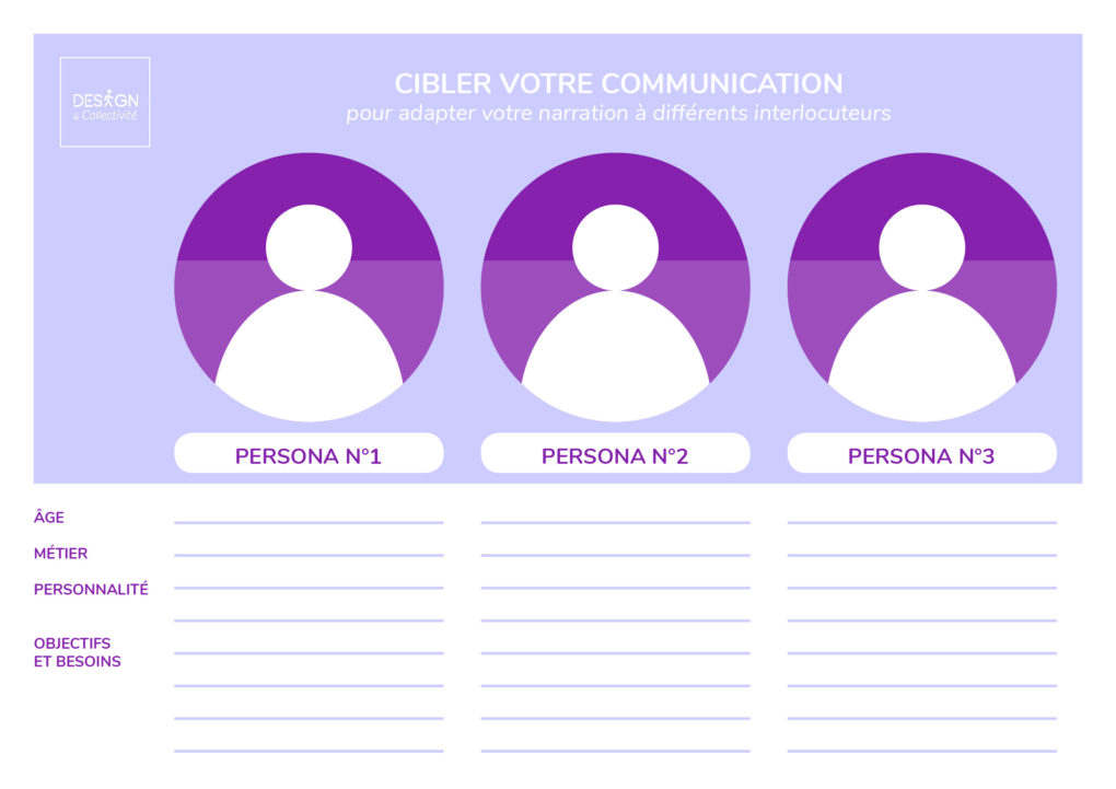 Si vous avez du mal à faire cet exercice, essayez d’identifier 2 ou 3 interlocuteurs, ceux qui écouteront votre histoire (ex : employeurs, collègues, famille, partenaires…). Vous pouvez réaliser une sorte de persona simplifié (une personne fictive qui représente les caractéristiques et les comportements d’un groupe d’individus). À partir de ce persona simplifié, vous pourrez imaginer comment lui raconter votre histoire en mettant en valeur vos qualités, compétences, parcours et votre vision au maximum.